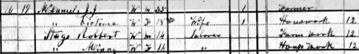 12. 1880 U.S. census, Woodruff County, Arkansas, population schedule, Barnes, p. 238B (stamped), dwelling 16, family 19, Minny and Robbert Stags ins household of J.J. McDaniel; image, Ancestry.com (http://www.ancestry.com: accessed 22 June 2020); citing NARA microfilm publication T9, roll 59.