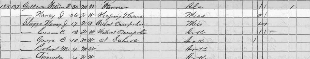 11. 1870 U.S. census, Woodruff, co. Arkansas, pop. sch., p. 479A (stamped), dwell. 138, fam. 137, Nancy J Gilleon in household of William T Gilleon.